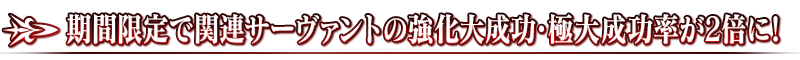 下記の期間中、対象のサーヴァントの強化をおこなった際に、大成功(経験値2倍ボーナス)・極大成功(経験値3倍ボーナス)の発生率が期間限定で2倍になります!