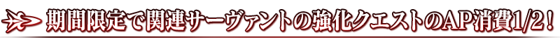 下記の期間中、対象のサーヴァントの強化クエストのAP消費量が期間限定で1/2になります! ※バトルにおいて撤退した場合でも、APの消費は1/2になります。