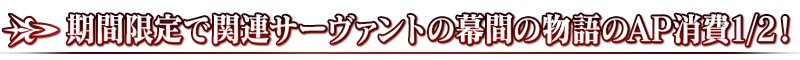 下記の期間中、対象のサーヴァントの幕間の物語のAP消費量が期間限定で1/2になります! ※バトルにおいて撤退した場合でも、APの消費は1/2になります。