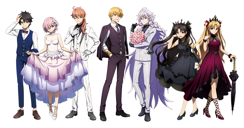 今回のキャンペーン用のイラストとして、藤丸立香、マシュ・キリエライト、ロマニ・アーキマン、ギルガメッシュ、マーリン、イシュタル、エレシュキガルが華やかなスーツ・ドレス姿で登場です!