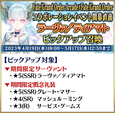 「Fate/Grand Order Arcade×Fate/Grand Orderコラボレーションイベント開幕直前キャンペーン」の開催を記念して、新登場の期間限定サーヴァント「★5(SSR)ラーヴァ/ティアマト」を含む3騎のサーヴァントと期間限定概念礼装3種をピックアップする3種類の召喚を開催いたします!