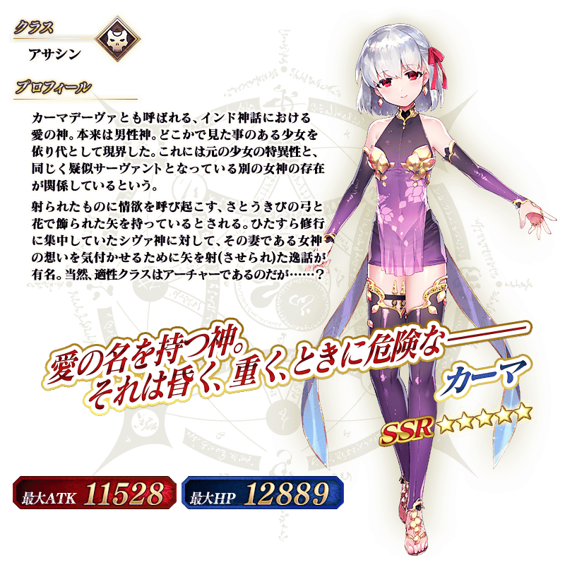 ※★4(SR)以上確定にはサーヴァントと概念礼装が含まれます。 ※アサシンクラス以外のサーヴァントも排出されますのでご注意ください。 ※2019年1月1日(火) 0:00以降に新たに配信されるメインストーリー、期間限定イベント、一部クエスト、キャンペーンおよび召喚では、真名隠し対象サーヴァントの真名が表示されます。