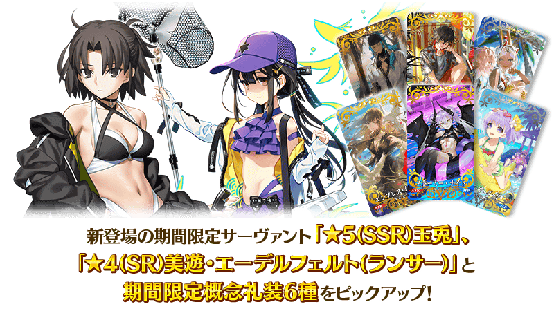 期間限定イベント「カルデア・U-サマーアイランド ~大統領は夏の夢を見るか?~」の開幕を記念して、新登場の期間限定サーヴァント「★5(SSR)玉兎」、「★4(SR)美遊・エーデルフェルト(ランサー)」と期間限定概念礼装6種をピックアップ!