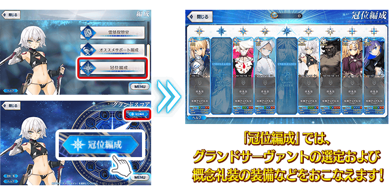 ※クエスト挑戦時のグランドサーヴァント編成枠にて、装備する礼装を変更することも可能です。変更をおこなった際は、「冠位編成」にも変更後の概念礼装の設定が反映されます。 ※「冠位戴冠戦」のクエスト選択場面からも「冠位編成」に移動できます。