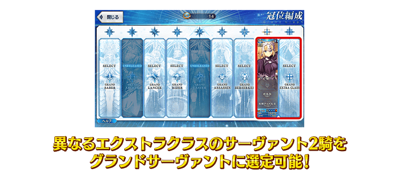 エクストラクラスのサーヴァントは、エクストラⅠ(ルーラー、アヴェンジャー、ムーンキャンサー、シールダー)もしくはエクストラⅡ(アルターエゴ、フォーリナー、プリテンダー、ビースト)から2騎をグランドサーヴァントとして選定し、冠位を戴冠させることができます。