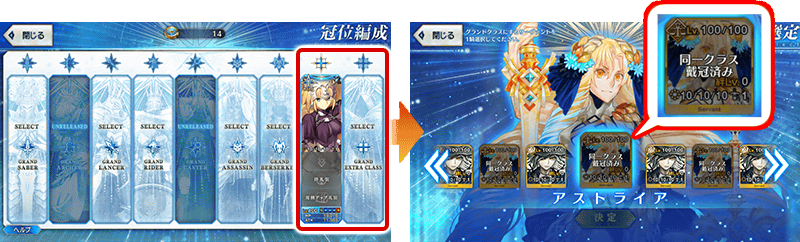 ※同一グループのサーヴァント2騎をグランドサーヴァントに選定することは可能ですが、「冠位研鑽戦」および「冠位認定戦」における『グランドサーヴァントのみを編成できる枠』に編成できるのは1騎のみとなります。