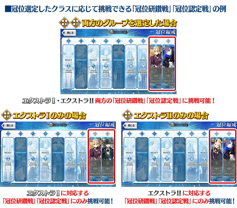 『冠位戴冠戦:Extra』の「冠位研鑽戦」「冠位認定戦」は、エクストラⅠとエクストラⅡに分かれており、それぞれ対応したグループのクラスのサーヴァントのみ挑戦することができます。