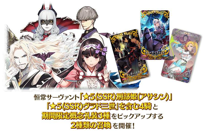 本召喚では、各召喚にてピックアップされている★5(SSR)サーヴァントのみが「確定召喚」による召喚の対象となります。