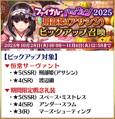 期間限定イベント「ファイナル・ハロウィン2025 ~パンプキンプラネットに輝く歌姫~」の開幕を記念して、恒常サーヴァント「★5(SSR)刑部姫(アサシン)」を含む4騎と期間限定概念礼装3種をピックアップ!
