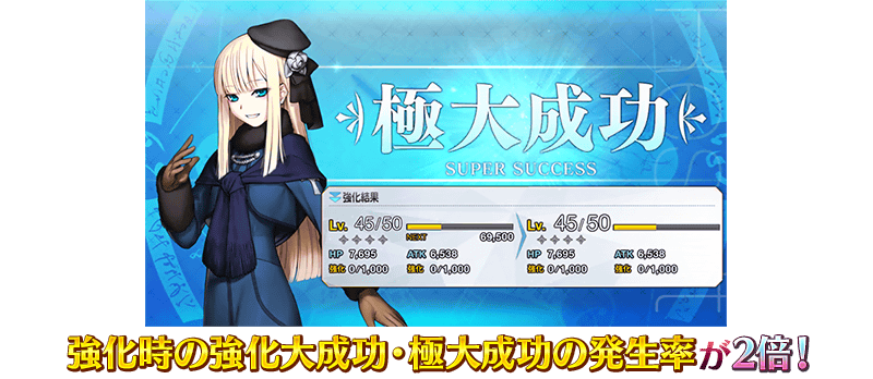 下記の期間中、イベントボーナスサーヴァントの強化をおこなった際に、大成功(経験値2倍ボーナス)・極大成功(経験値3倍ボーナス)の発生率が期間限定で2倍になります!