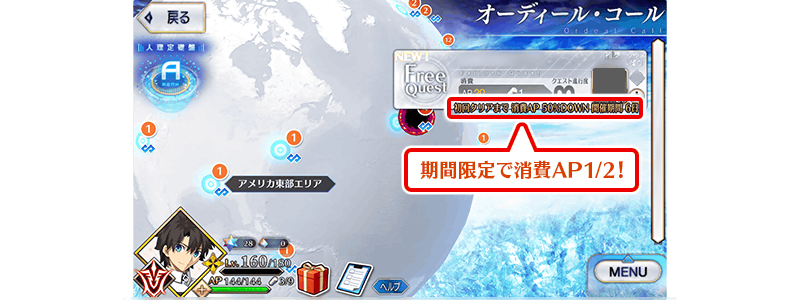 下記の期間中、「奏章Ⅳ 人類裁決法廷 トリニティ・メタトロニオス」クリアでメインストーリーのすべてのフリークエストの初回クリアまでの消費APが1/2になります!