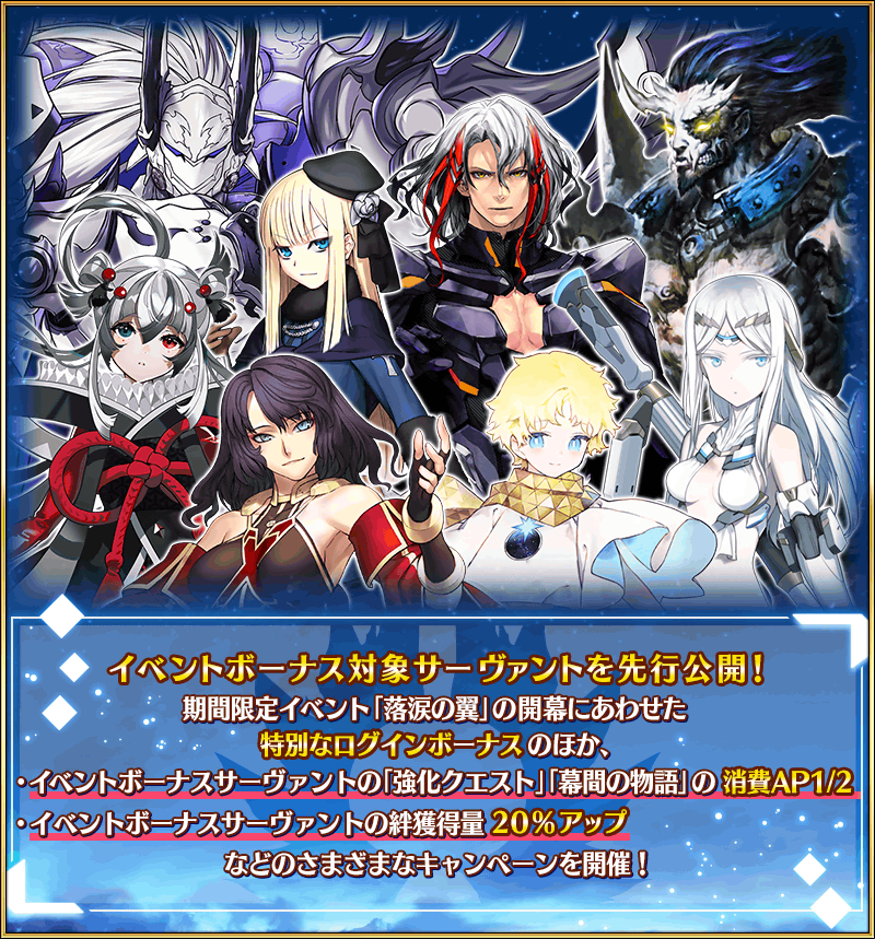 期間限定イベント「落涙の翼」の期間中、一部のサーヴァントはイベントクエストにおける「自身の攻撃の威力がアップ」と「絆ポイント獲得量がアップ」のボーナスを得られます!