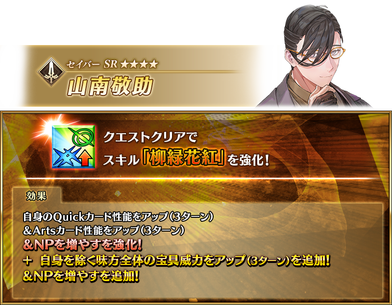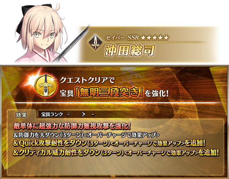 「★5(SSR)沖田総司(セイバー)」「★4(SR)山南敬助」が強化される特別なクエスト「サーヴァント強化クエスト」が、カルデアゲートに恒常的に追加されます。