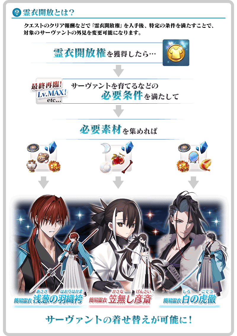 ※対象の霊衣開放権は、期間限定イベント「幕末チャンバラ神話 ぐだぐだ新選組・ジ・エンド REVENGE OF MAKOTO」のイベント開催期間およびイベントアイテム交換期間のみ入手可能です。 ※対象の霊衣開放権の対象サーヴァントを未所持の場合、霊衣開放権の入手はできますが、霊衣開放はおこなえませんのでご注意ください。 ※対象の霊衣は外見のみ変化し、ボイスは変化しない「簡易霊衣」です。