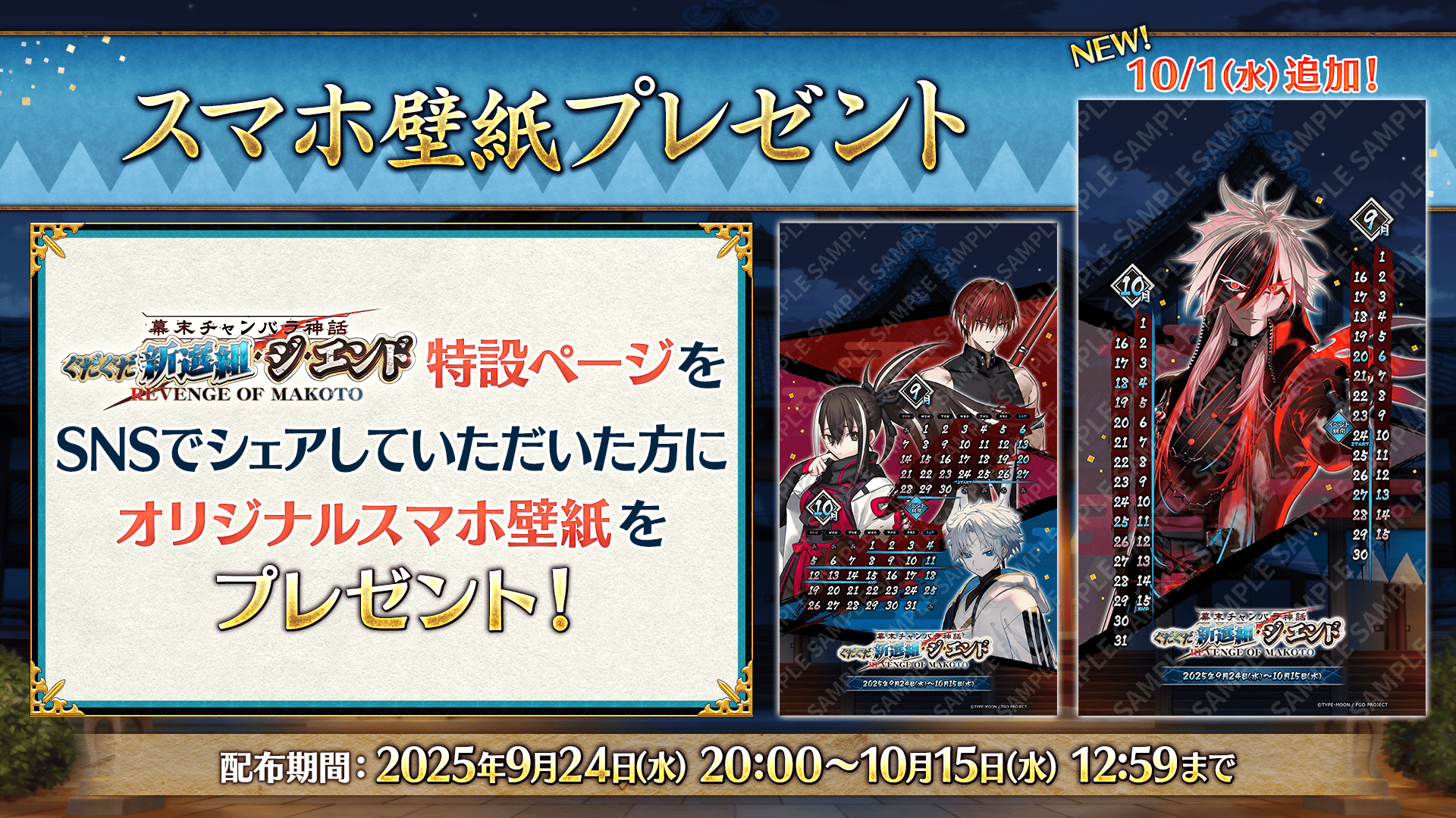 期間限定イベント「幕末チャンバラ神話 ぐだぐだ新選組・ジ・エンド REVENGE OF MAKOTO」の特設ページにて、スマートフォン向け壁紙のプレゼントが実施中!