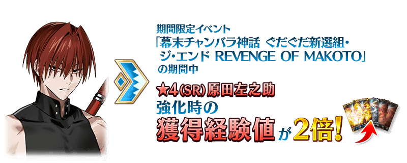本イベントの期間中は、「★4(SR)原田左之助」を強化した際の獲得経験値が2倍になります。