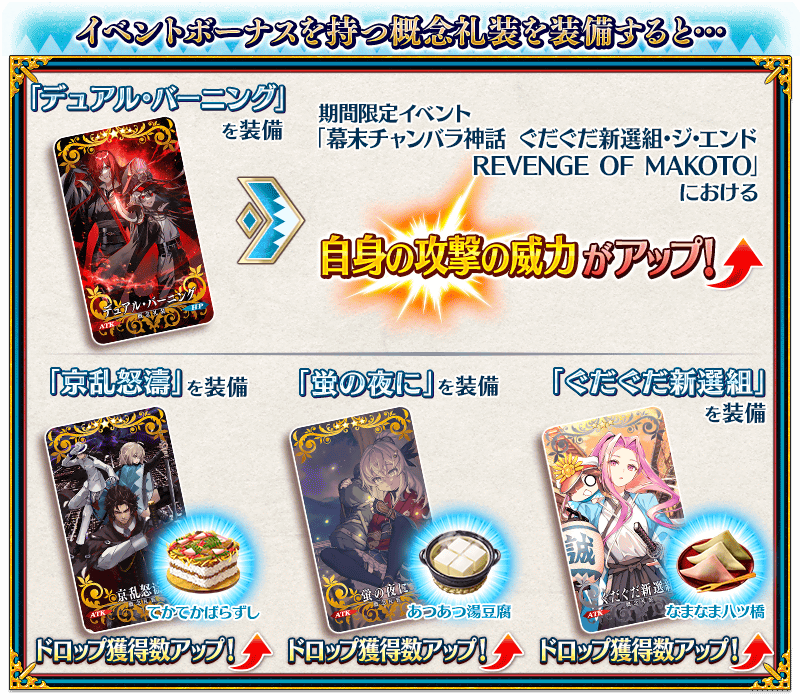 期間限定イベント「幕末チャンバラ神話 ぐだぐだ新選組・ジ・エンド REVENGE OF MAKOTO」のイベント限定の報酬として、概念礼装を大幅に強化できるEXPカードを入手できます!