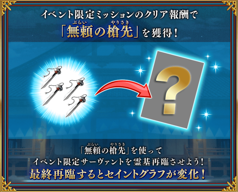 イベント限定ミッションのクリア報酬として、原田左之助の霊基再臨に必要な「無頼の槍先」を入手できます。
