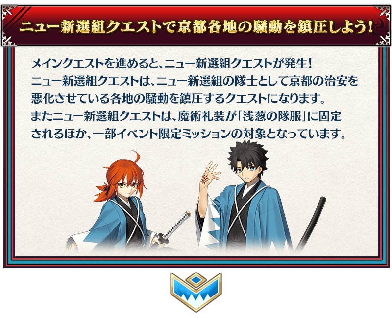 またニュー新選組クエストは、魔術礼装が「浅葱の隊服」に固定されるほか、一部イベント限定ミッションの対象となっています。