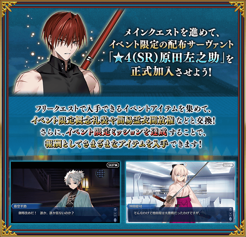 メインクエストを進めることで、イベント限定の配布サーヴァント「★4(SR)原田左之助」が正式加入します。
