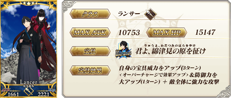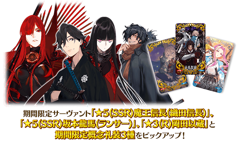 期間限定イベント「幕末チャンバラ神話 ぐだぐだ新選組・ジ・エンド REVENGE OF MAKOTO」の開幕を記念して、期間限定サーヴァント「★5(SSR)魔王信長(織田信長)」、「★5(SSR)坂本龍馬(ランサー)」、「★3(R)岡田以蔵」と期間限定概念礼装3種をピックアップ!