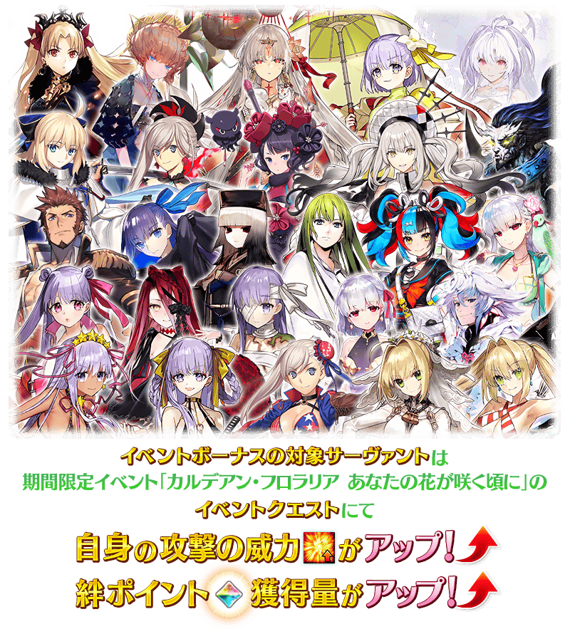 期間限定イベント「カルデアン・フロラリア あなたの花が咲く頃に」の期間中、一部のサーヴァントはイベントクエストにおける「自身の攻撃の威力がアップ」と「絆ポイント獲得量がアップ」のボーナスを得られます!