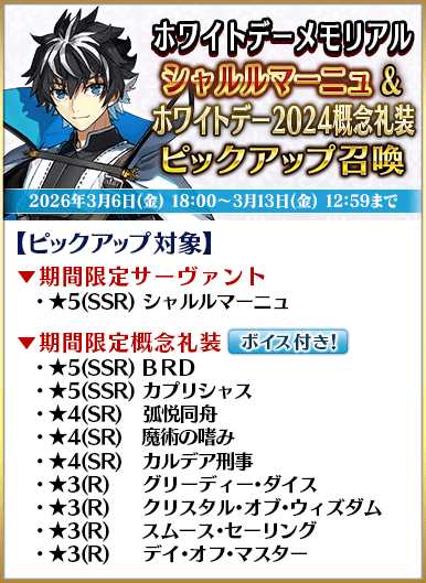 【ボイス付きの概念礼装がピックアップされる召喚一覧】 ・ホワイトデーメモリアル ダンテ・アリギエーリ&ホワイトデー2025概念礼装ピックアップ召喚 ・ホワイトデーメモリアル シャルルマーニュ&ホワイトデー2024概念礼装ピックアップ召喚 ・ホワイトデーメモリアル 高杉晋作&ホワイトデー2023概念礼装ピックアップ召喚 ・ホワイトデーメモリアル アルジュナ〔オルタ〕&ホワイトデー2022概念礼装ピックアップ召喚