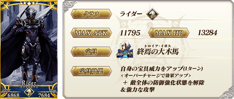 ※上記の「★5(SSR)オデュッセウス」のイラストは霊基再臨第2段階のものです。 ※上記の「★5(SSR)オデュッセウス」のセイントグラフは、簡易霊衣「アイギス(第二再臨)」開放前の霊基再臨第2段階のものです。 ※簡易霊衣「アイギス(第二再臨)」を開放すると、「★5(SSR)オデュッセウス」の霊基再臨第2段階のセイントグラフとフェイス画像が顔を出している状態のものに変化し、上記のセイントグラフは簡易霊衣「アイギス(第二再臨)」のものになります。