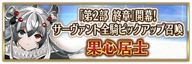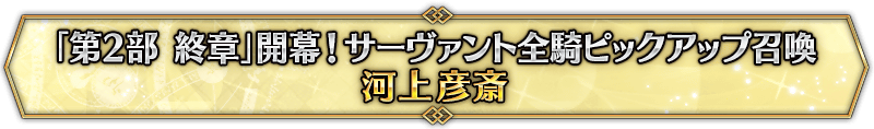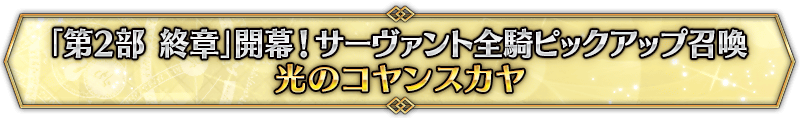 なお、本召喚は『「第2部 終章」開幕! サーヴァント全騎ピックアップ召喚』ピックアップスケジュールに記載された日程で召喚内容が切り替わりますが、開催期間内において複数回おこなわれる同名ピックアップ召喚は召喚回数がリセットされずに引き継がれます。