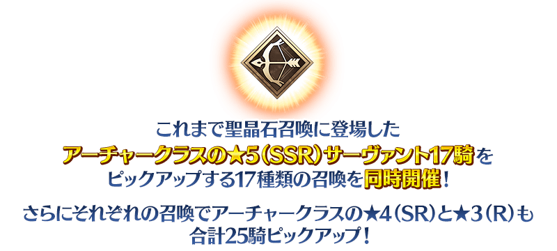 2025年11月14日(金)に予定している「冠位戴冠戦:Archer」の開幕に先駆けて、これまで聖晶石召喚に登場した期間限定サーヴァントを含むアーチャークラス42騎をピックアップする17種類の召喚を同時開催いたします!