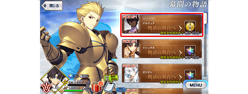 「幕間の物語」の開放条件も、通常時は対象サーヴァントの「絆Lv.」「霊基再臨段階」も条件となるところを、「特定のメインクエストのクリア」または「幕間の物語の前節のクリア」のみに緩和されます。