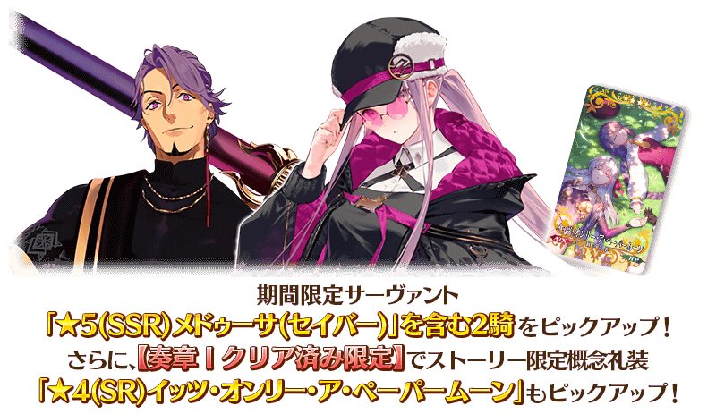 「奏章Ⅰ」に関連するサーヴァントの中から期間限定サーヴァント「★5(SSR)メドゥーサ(セイバー)」、ストーリー召喚サーヴァント「★4(SR)ドゥリーヨダナ」をピックアップする召喚を開催いたします!