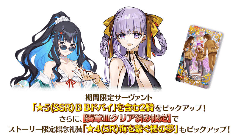 ※本召喚において、ストーリー限定の概念礼装「★4(SR)海を繋ぐ櫻の夢」は「奏章Ⅲ 新霊長後継戦 アーキタイプ・インセプション」をクリア済みの場合のみ排出され、ピックアップ対象となります。対象となるメインクエストをクリアしていない場合はピックアップ対象外となり、本召喚では排出されませんのでご注意ください。
