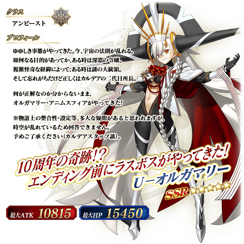 ※上記の「★5(SSR)U-オルガマリー」のイラストは霊基再臨第2段階のものです。 ※「★5(SSR)U-オルガマリー」の宝具は再臨段階によって演出が変化いたします。 ※「★5(SSR)U-オルガマリー」のスキルは再臨段階によって名称が変化いたします。 ※第3段階へ霊基再臨させた後、第1・第2段階時のスキルを使用したい場合は、サーヴァント詳細画面でバトルキャラの設定を第1段階または、第2段階に変更することで使用可能になります。