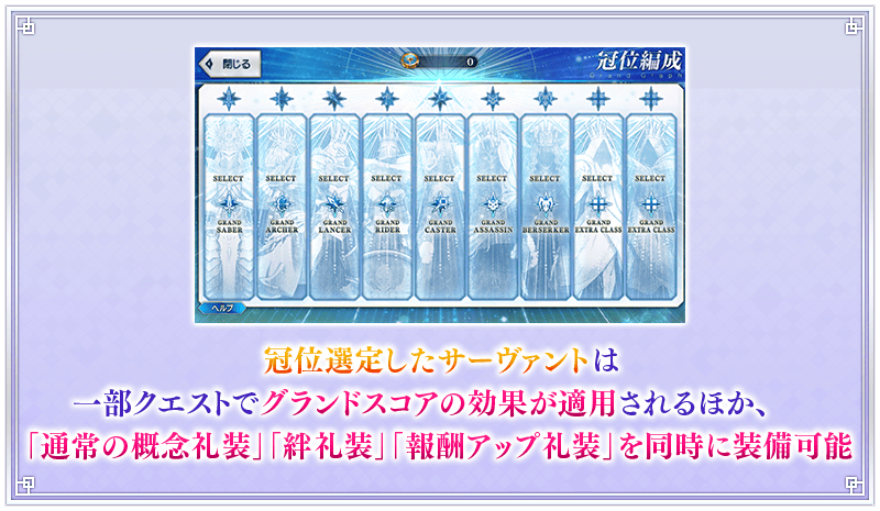 「第2部 終章」の一部メインクエストとレイドバトルでは、グランドサーヴァントをパーティに編成した際にグランドスコアの効果が適用されるようになります。