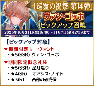 「巡霊の祝祭 第14弾」対象サーヴァントに関連するサーヴァントの中から、期間限定サーヴァント「★5(SSR)ヴァン・ゴッホ」と「★5(SSR)アビゲイル・ウィリアムズ」をピックアップする2種類の召喚を開催いたします!