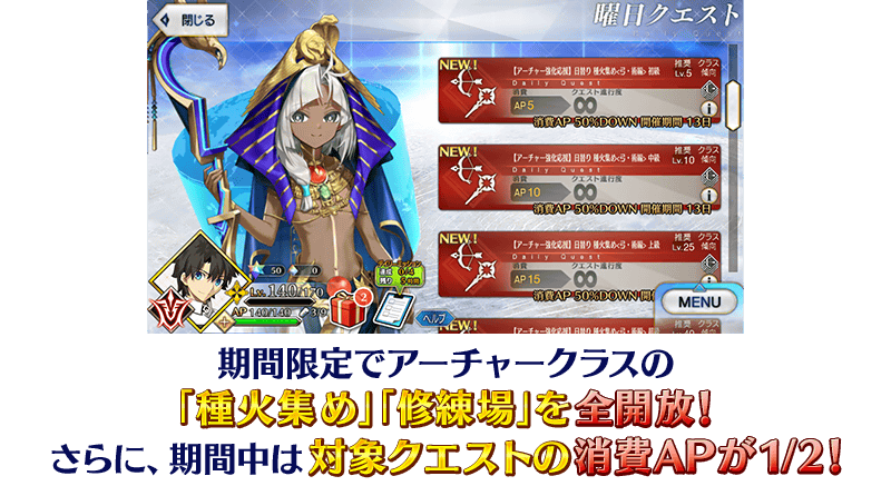 新たな戦いに備えるために、アーチャークラスのサーヴァント強化をサポートするキャンペーンを開催いたします!