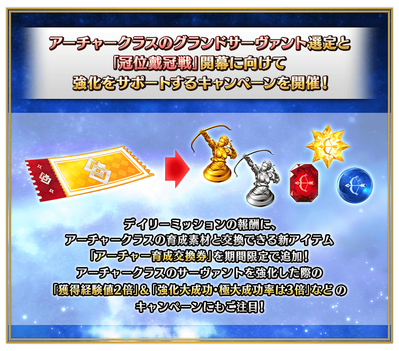 新たな戦いに備えるために、アーチャークラスのサーヴァント強化をサポートするキャンペーンを開催いたします!