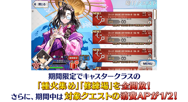 限定 キャスタークラスの「種火集め」「修練場」を全開放&消費AP1/2!