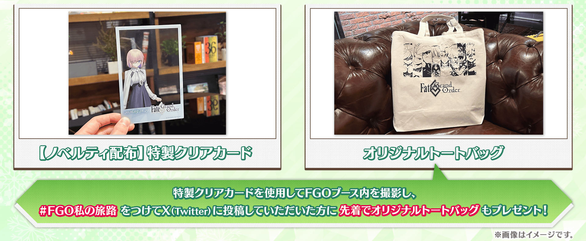 「Fate/Grand Order」ブース内で配布するノベルティ「特製クリアカード」を使用してFGOブース内を撮影し、ハッシュタグ「#FGO私の旅路」をつけてX(Twitter)に投稿していただいた方に、先着でオリジナルトートバッグもプレゼントいたします。