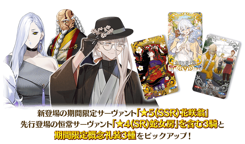 期間限定イベント「カルデアン・フロラリア あなたの花が咲く頃に」の開幕を記念して、新登場の期間限定サーヴァント「★5(SSR)花咲翁」、先行登場の恒常サーヴァント「★4(SR)蛇女房」を含む3騎と期間限定概念礼装3種をピックアップ!