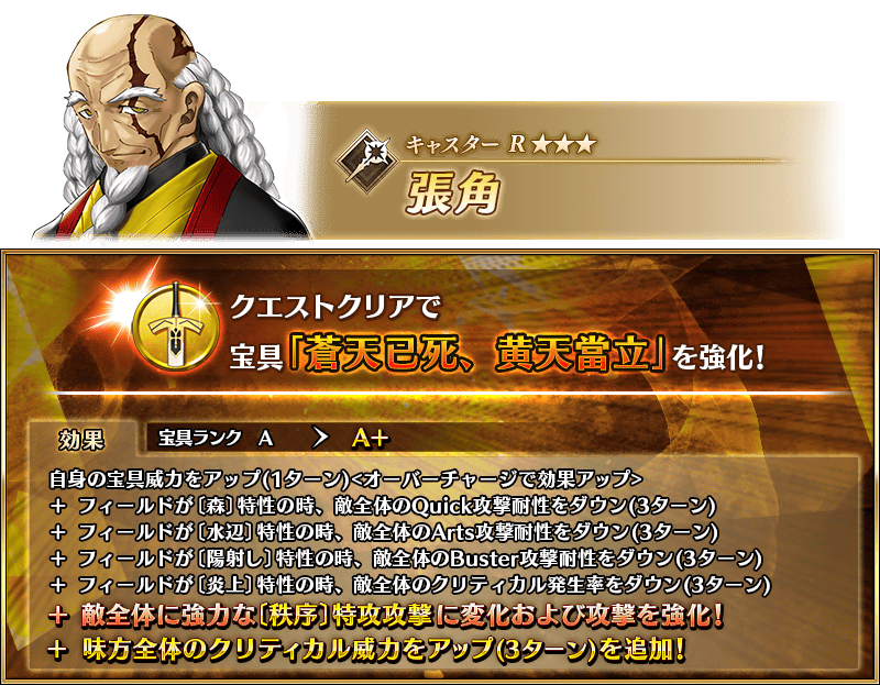 「★3(R)張角」が強化される特別なクエスト「サーヴァント強化クエスト」が、カルデアゲートに恒常的に追加されます。