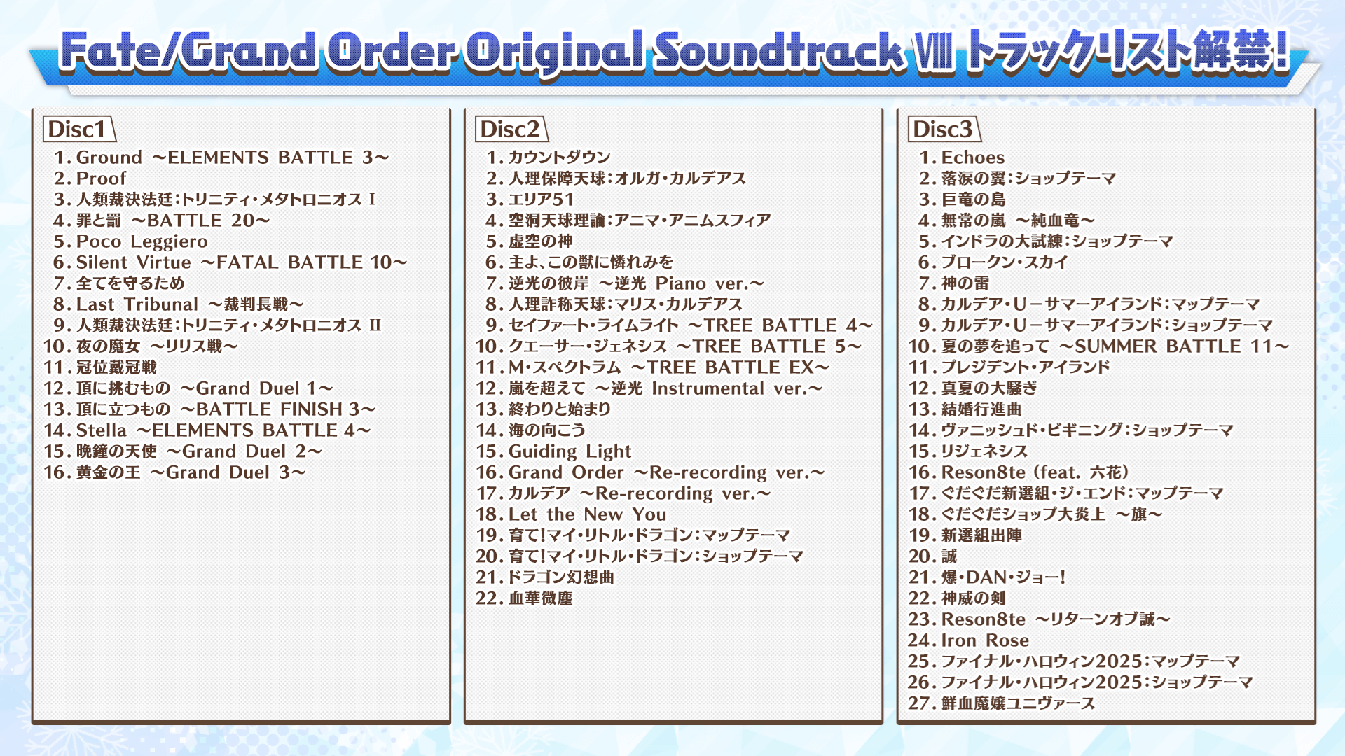 2026年7月1日(水)に発売する「Fate/Grand Order Original Soundtrack Ⅷ」のトラックリストを解禁いたしました。