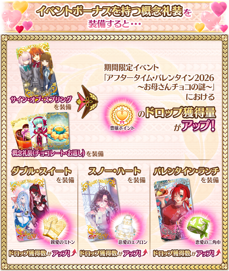 期間限定イベント「アフタータイム・バレンタイン2026 ~お母さんチョコの謎~」の期間中、一部のサーヴァントはイベントクエストにおける「自身の攻撃の威力がアップ」と「絆ポイント獲得量がアップ」のボーナスを得られます!