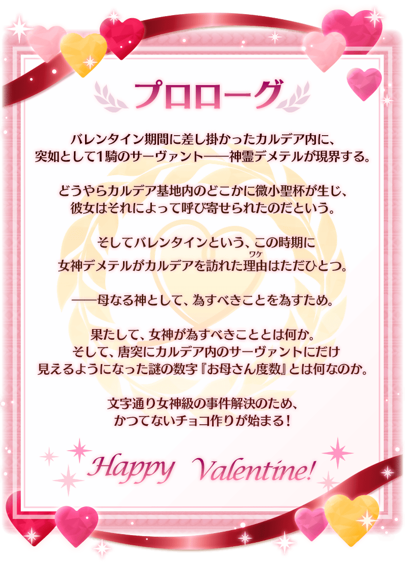 期間限定イベント「アフタータイム・バレンタイン2026 ~お母さんチョコの謎~」では、新登場の期間限定サーヴァント「★5(SSR)デメテル」と「2026年2月8日(日)までに登場した一部を除いたサーヴァント」にチョコをわたすことができるようになります。