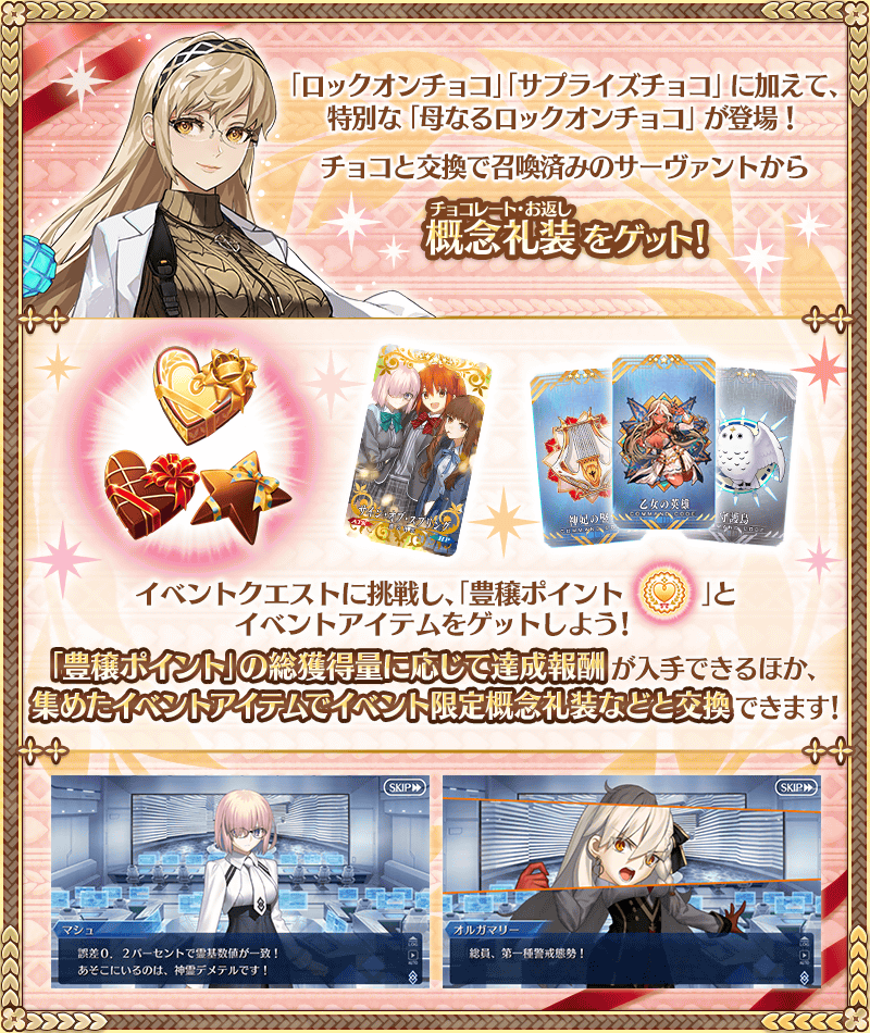 イベントクエストに挑戦して「豊穣ポイント」を集め、イベント交換アイテム「ロックオンチョコ」「サプライズチョコ」を入手し、サーヴァントから概念礼装(チョコレート・お返し)をもらいましょう!