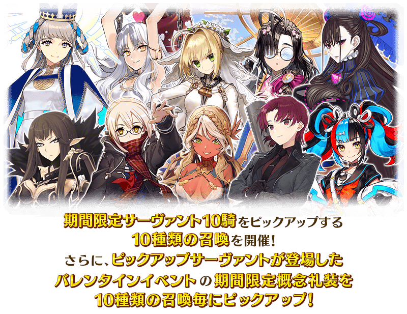 『「バレンタイン2026」開幕直前キャンペーン』の開催を記念して、バレンタインイベントに登場した期間限定サーヴァント10騎と、バレンタインイベントで登場した期間限定概念礼装33種をピックアップする10種類の召喚を開催いたします!