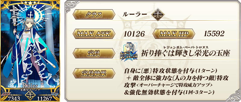 ※上記の「★5(SSR)女教皇ヨハンナ」のイラストとセイントグラフは霊基再臨第3段階のものです。
