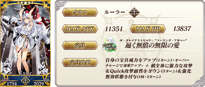 ◆最大解放時効果◆ 自身のQuickカード性能を15%アップ&宝具威力を15%アップ&NP獲得量を20%アップ |