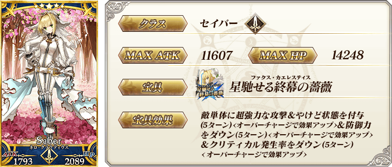 ◆最大解放時効果◆ 自身の登場時にスターを12個獲得(1回)&Busterカード性能を5%アップ&宝具威力を10%アップ |